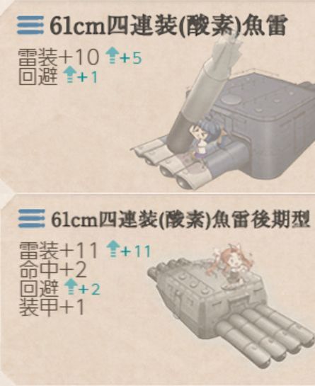 61cm四連装(酸素)魚雷後期型を1本ずつ載せて、両方の装備ボーナスを取る形です。