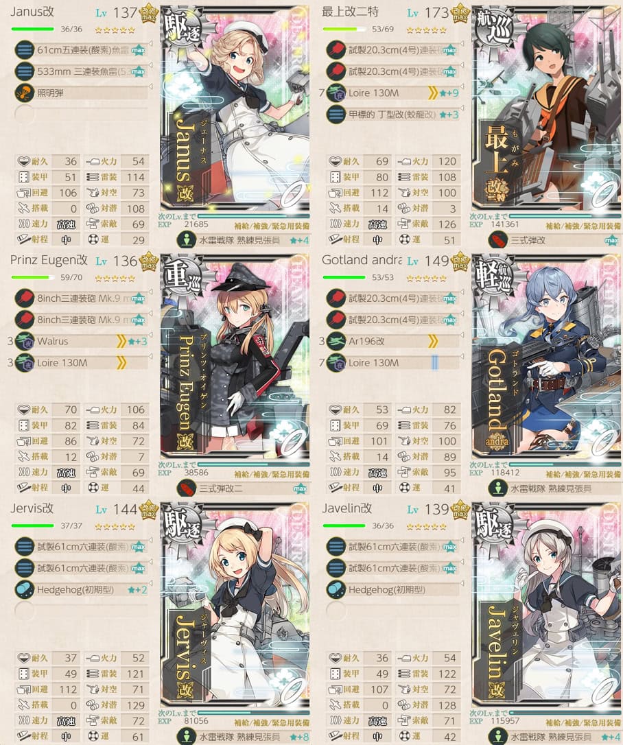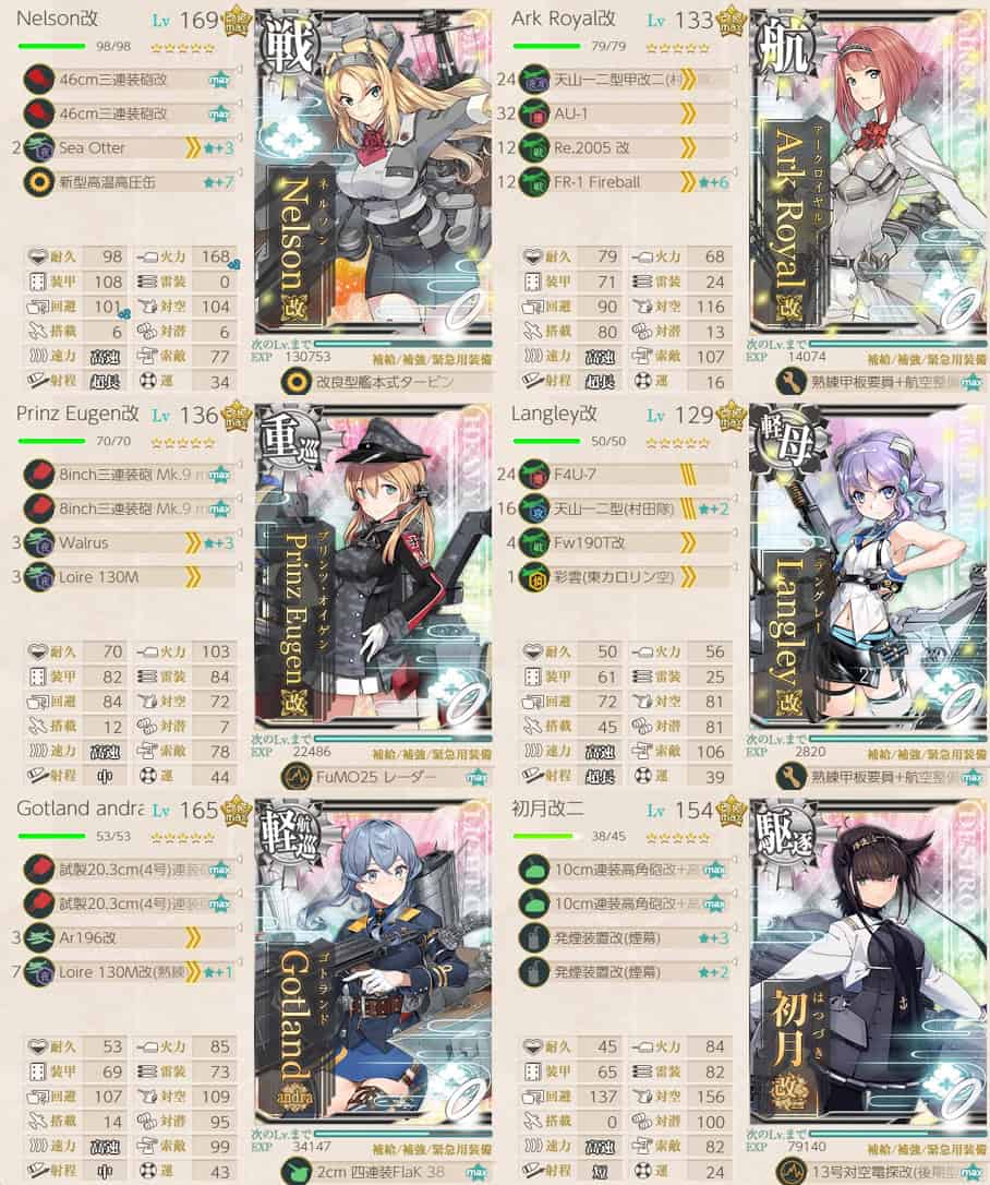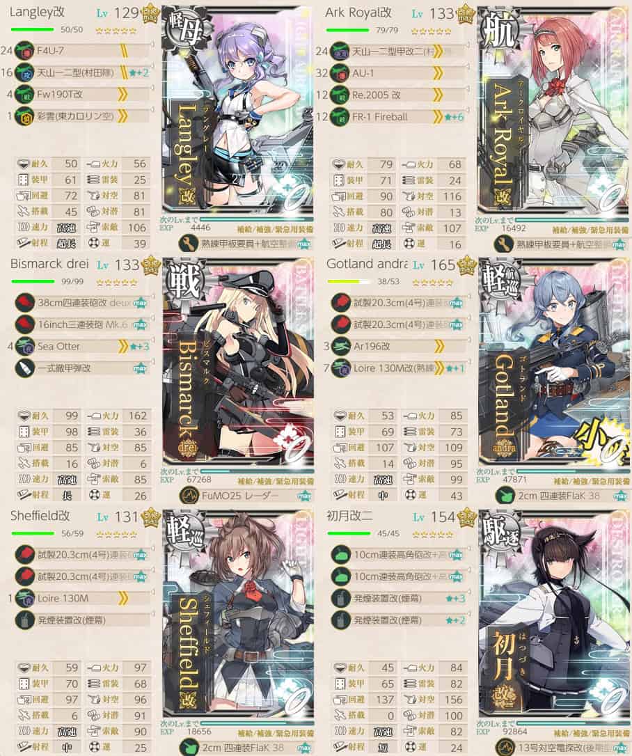 いちおうこの編成で15回程度出撃して、反航戦も含めてすべてS勝利でしたが、いかんせん試行回数が少ないのと、反航戦で夜戦の最終打順まで回ることもあったので、そこは少し心配です。
