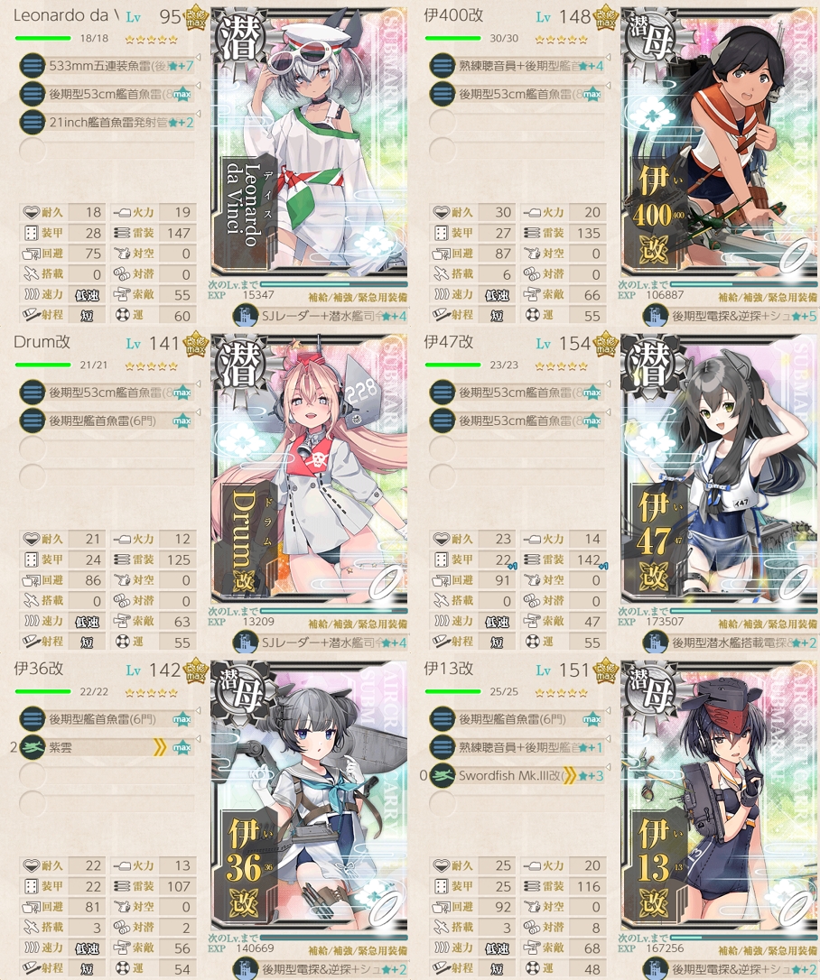 先述の記事によると、運上げ前提だと伊401や伊14が強いようなのですが、今のところ、まるゆは特殊砲撃可能な戦艦に食べさせるのが優先かなと思っています。