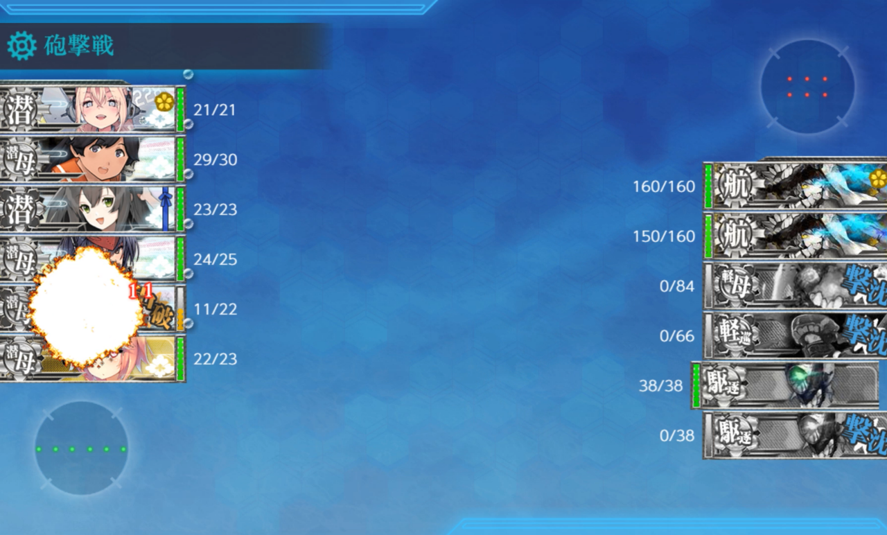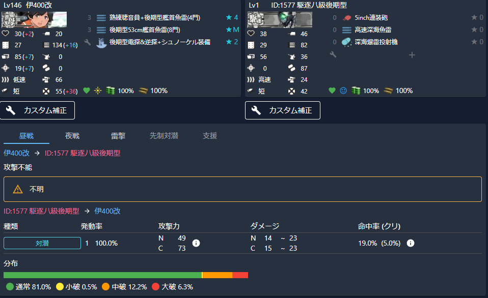 伊400は伊36よりも装甲が高いのですが、敵艦隊が輪形陣な分、当たった場合には大破確率が高くなっているようです。