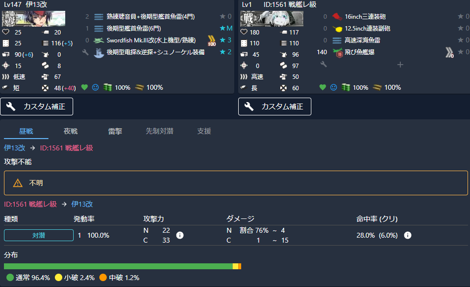 なお今のところ道中のみを考えるつもりをしていますが、ボス戦でも昼戦で中大破させられて夜戦で行動できない/火力が落ちるということは起こりえます。