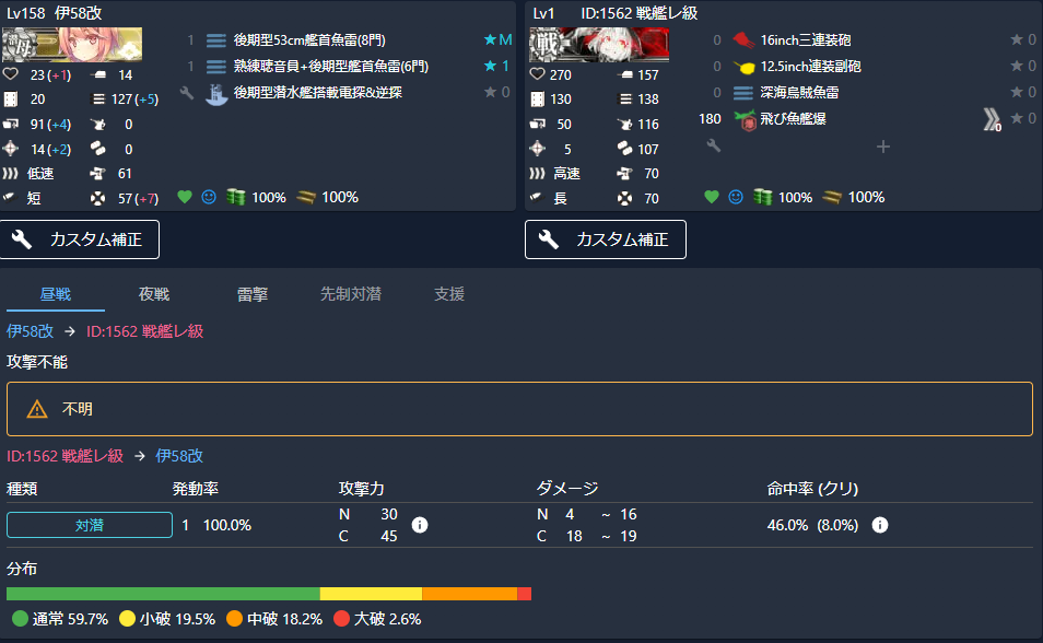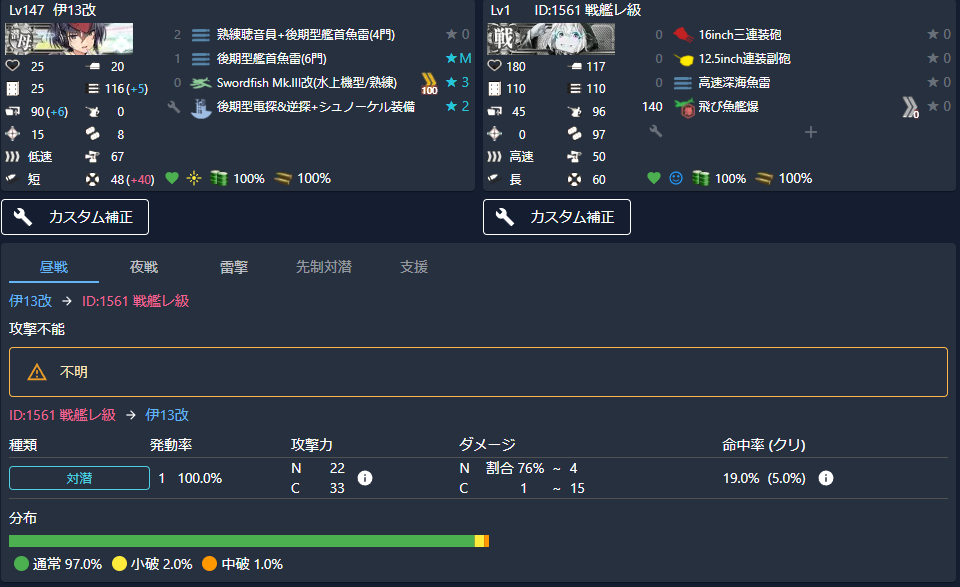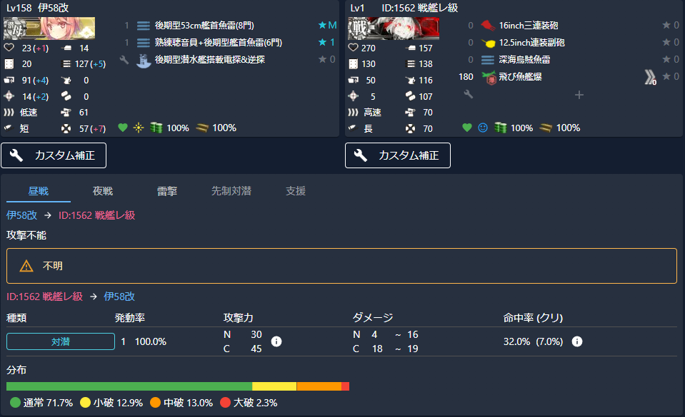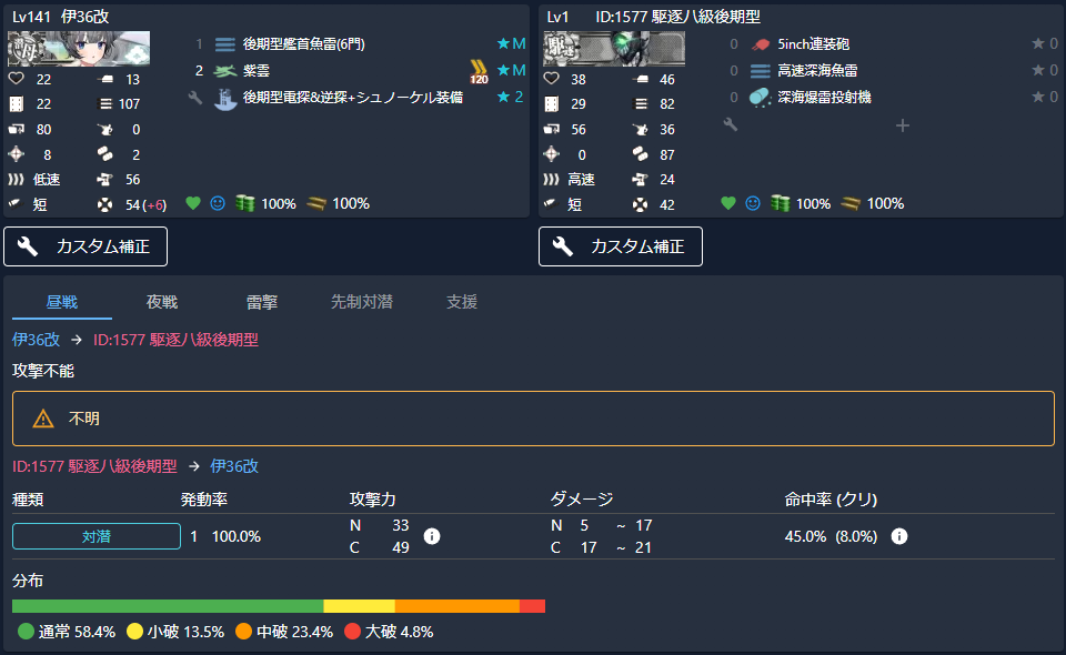 命中率が45%あり、総合的には(命中率込みの計算値)中破確率が23.4%、大破確率も5%弱あるようです。