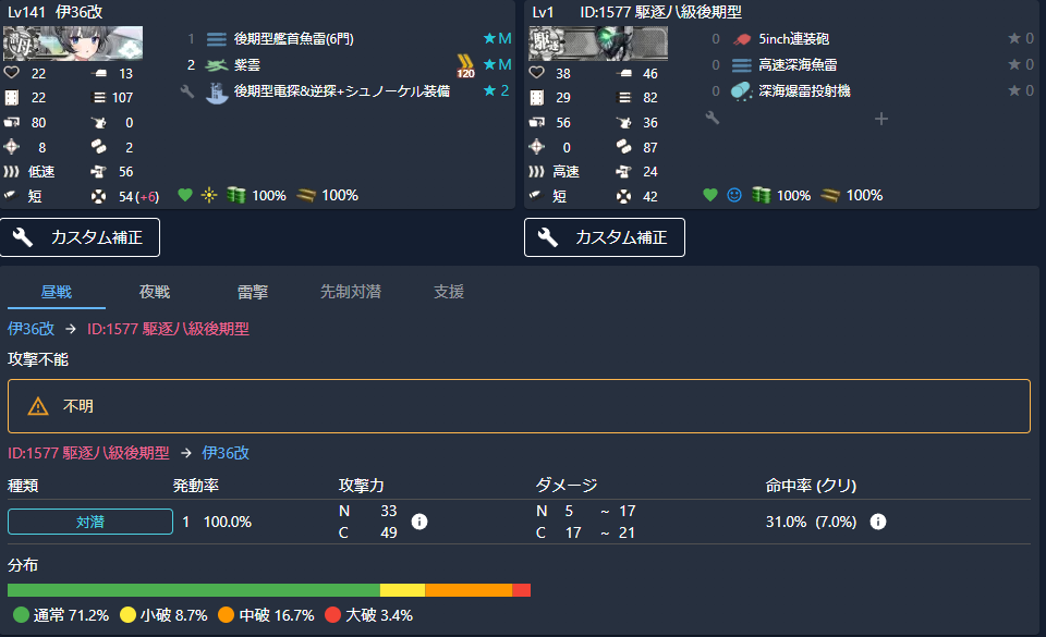 計算してみると、命中率が31%に低下し、総合的には中破16.7%、大破3.4%に減るようです。