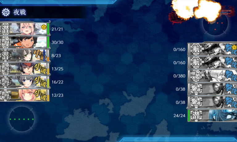 ボス夜戦が必要になるのは、ボス戦の前に警戒艦(4~6番艦)が中破していたり、全体に小破の艦が溜まっていたりする時が多かったです。