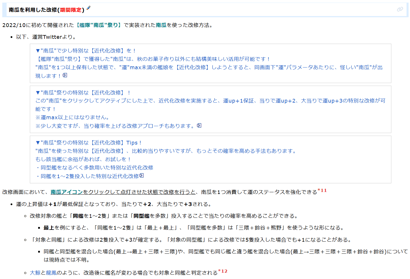 集めた南瓜はアイテムと交換できる他、近代化改修に使うことで運を上げることができます。ただし、運+3を狙うには同名 or 同型艦が必要。以下、艦これwikiの説明です。