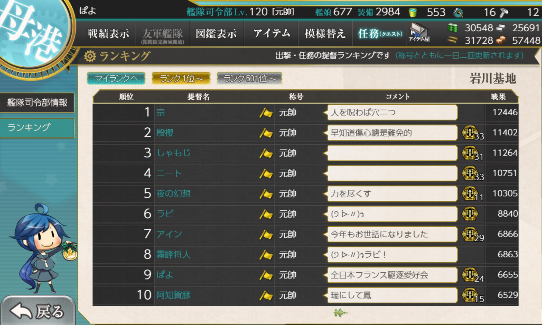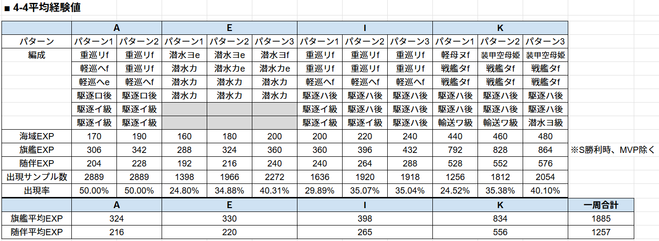 なお旗艦に置いてずっとMVPが取れない場合、計算してみると、1周あたりの獲得経験値は平均1885のようです。