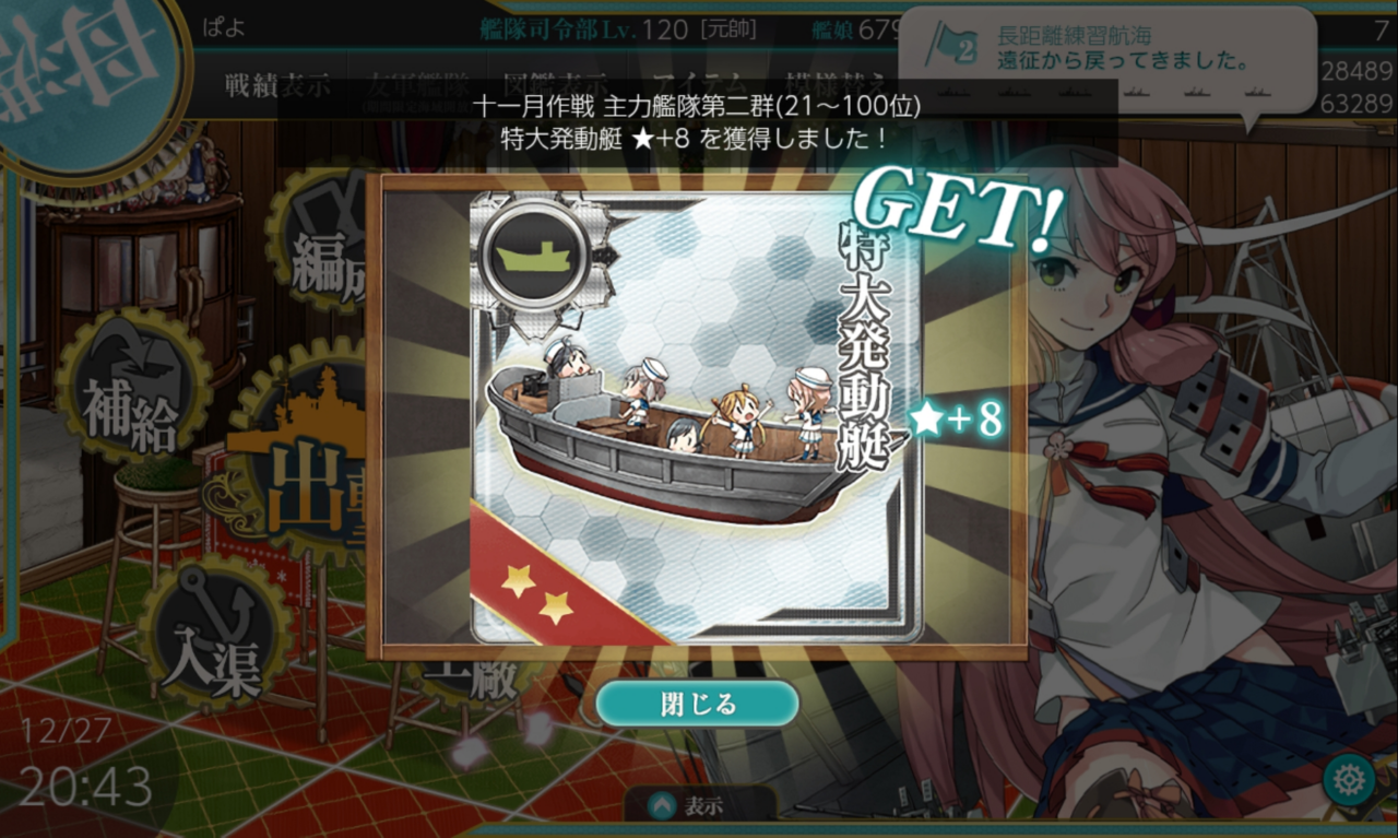特大発艇はもう揃っているので必要ないのですが、長距離練習航海(キラ無し)用の編成艦には、未改修の大発・特大発を載せっぱなしにしてるので、そこに入れておこうと思います。