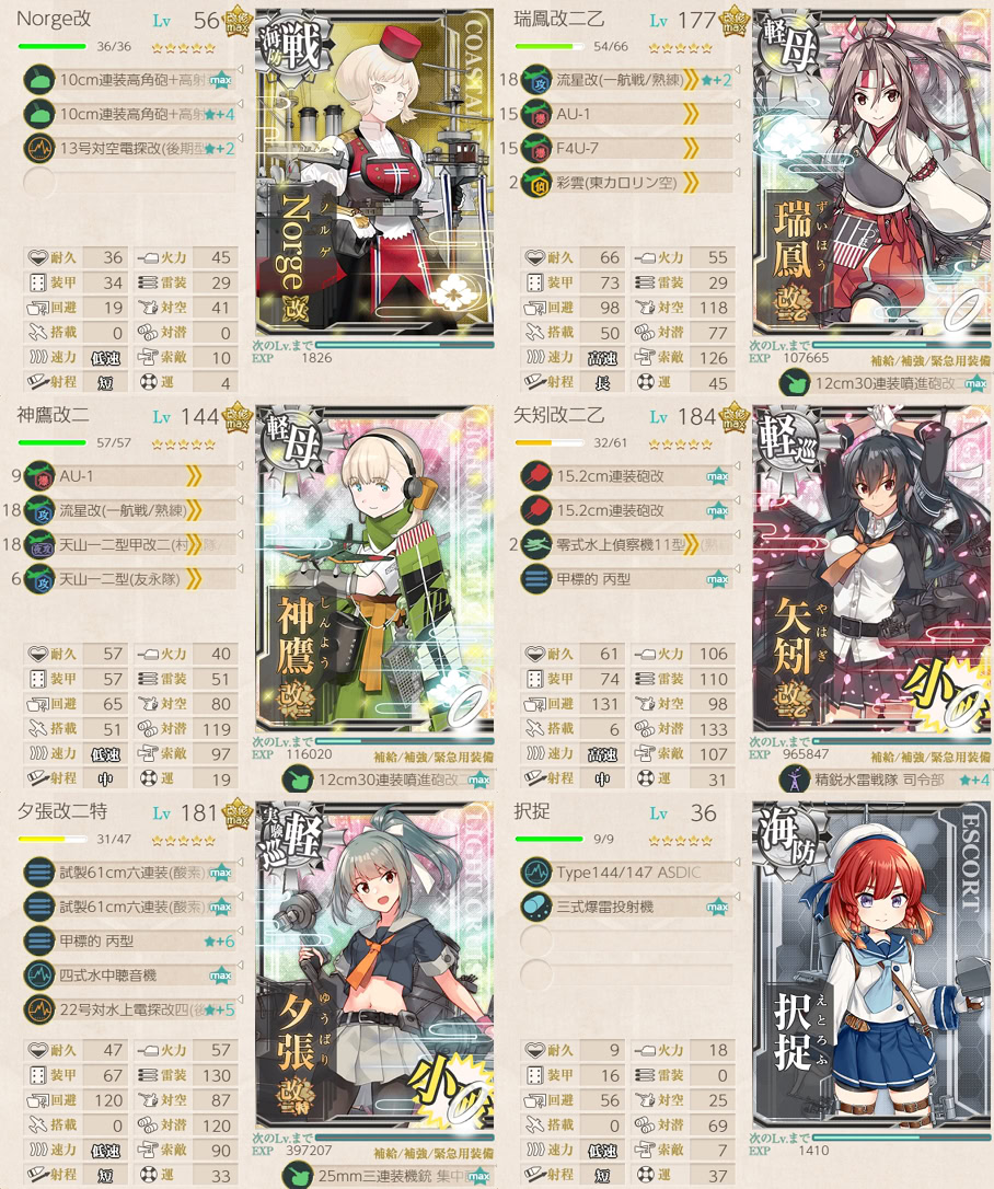 軽空母3が無難なんですが、ボーキ節約したくて矢矧に入れ替え。これで1周ボーキ消費25くらいに抑えられます。