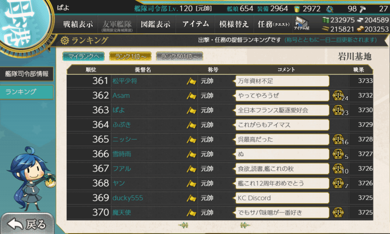 ようやくバケツがカンスト付近まできたので資材備蓄にシフトしたんですが、なかなか思うようには増やせず……相変わらず備蓄が下手です。