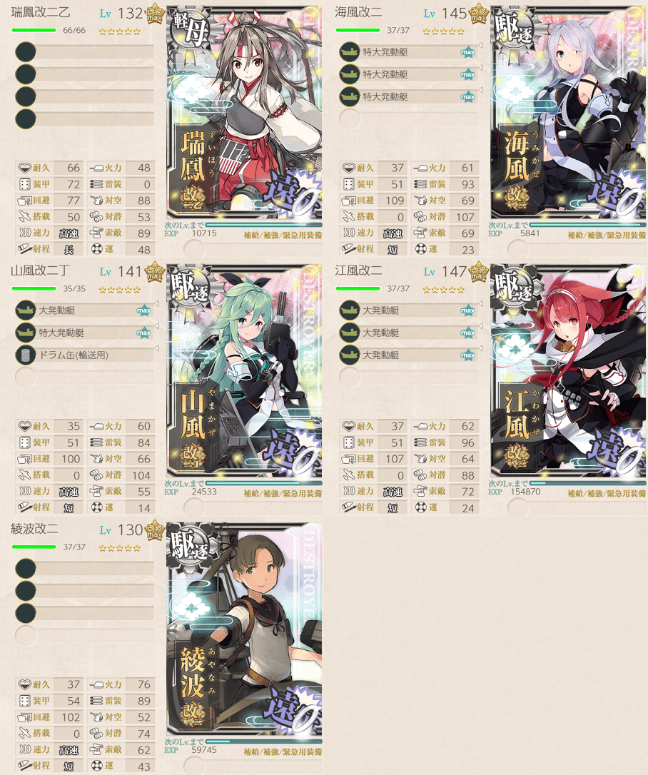 旗艦レベル型遠征なのでキラ付けの手間が少ないのは楽ですね。ボーキサイト獲得の時間効率では全遠征中2番目だそうです(66.1 /h)。