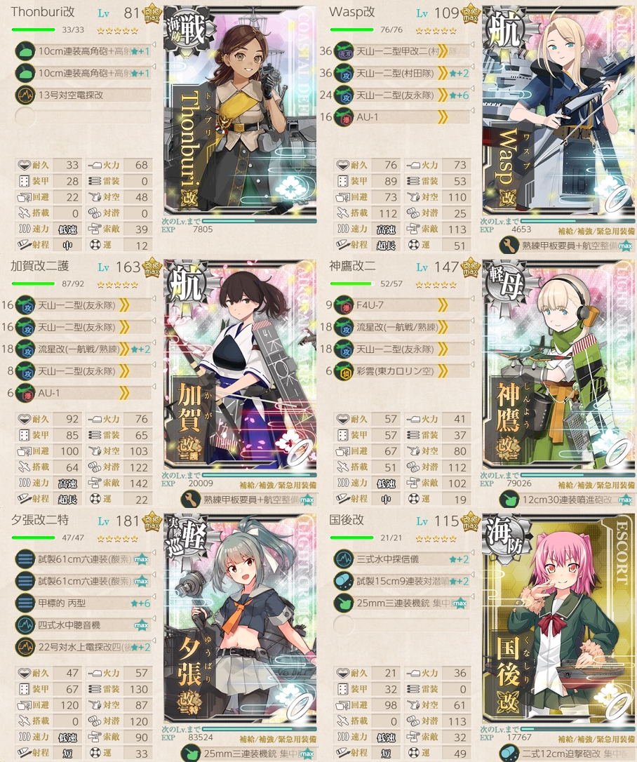 頻度は低いですが旗艦が被弾した際のバケツ消費/途中撤退の低減を狙うのと、これらの艦は十分にレベルが上がっているのでこれ以上経験値を入れなくて良いかな?と思ったので。