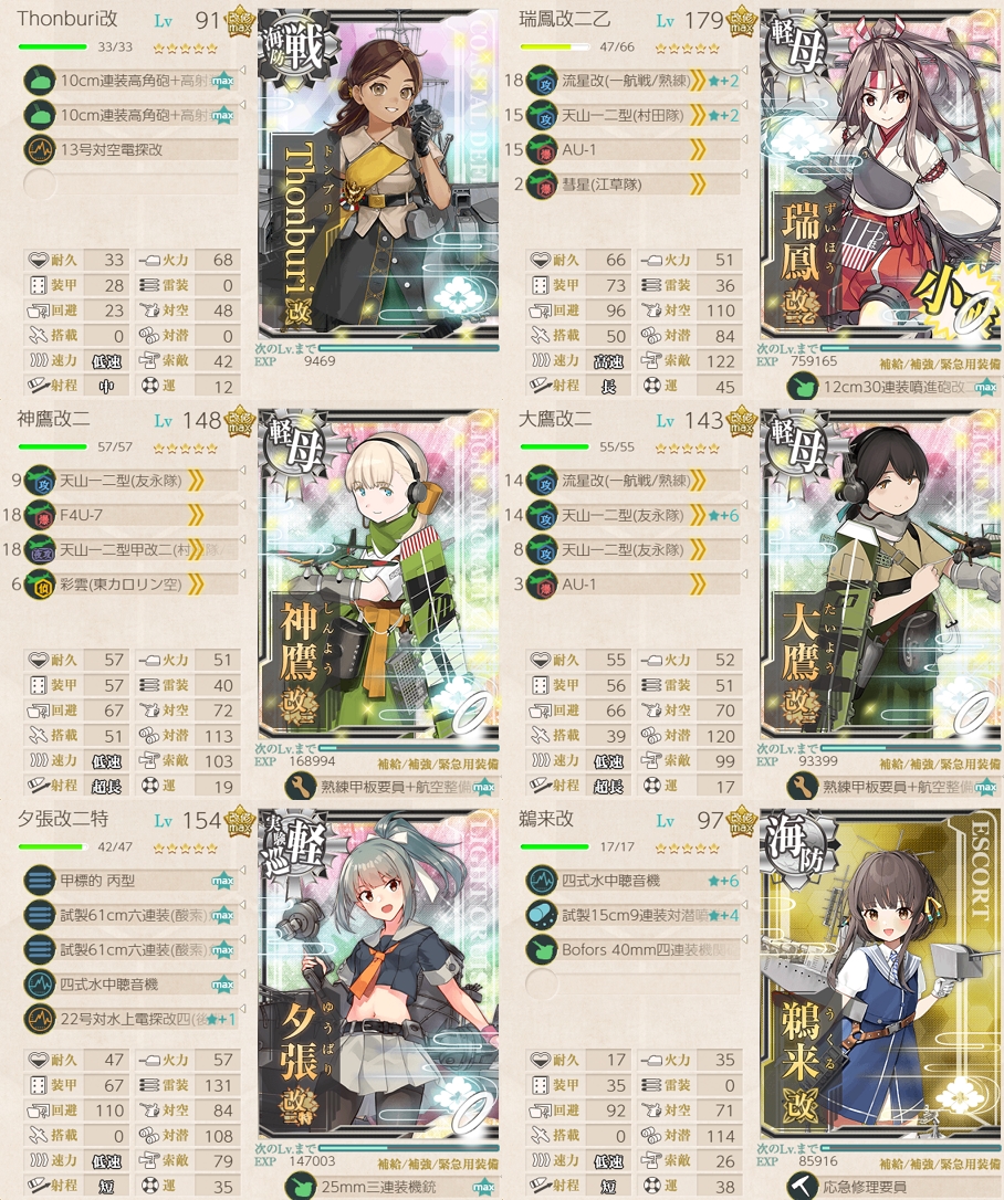 Thonburiは射程が中なので正規空母は射程を超長に伸ばしていますが、旗艦が射程短であれば、噴進砲改二に変更した方がバケツ消費が若干減ります。