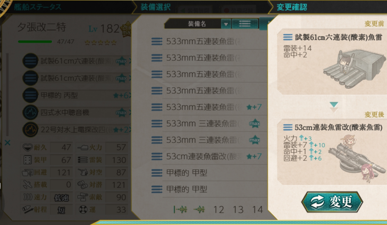 謎の新型魚雷は夕張にもボーナスがつくようで、早速4-4で使っています。