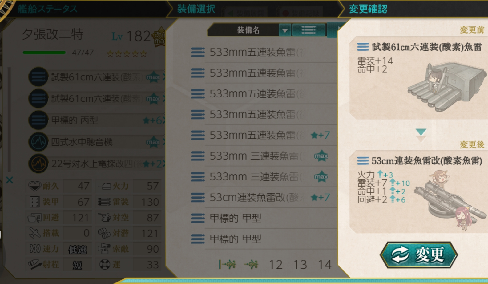 触接開始率の都合で矢矧には水偵を載せます。魚雷装備より主砲の方がわずかに結果は良くなります。